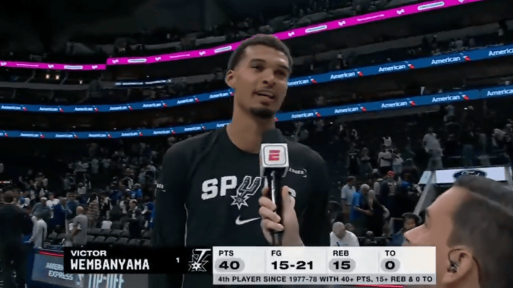 马刺球员维克托-文班亚马出战29分钟,得到40分15篮板1助攻1抢断3封盖且0失误。