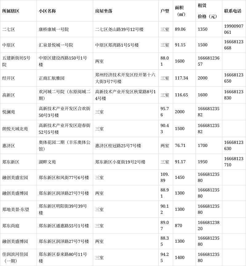 本批次配租房源共计15套(41间),其中为二七区1套(3间)、中原区2套(5间)、经开区1套(3间)、高新区3套(9间)、惠济区1套(2间)、郑东新区7套(19间)。水电费均为民用水电标准,房源精装修交付,周边配套设施齐全,配备家具家电,拎包入住,后续房源将根据装修进度情况陆续配租,具体以系统实际上线为准。运营单位为郑州城发安居有限公司。